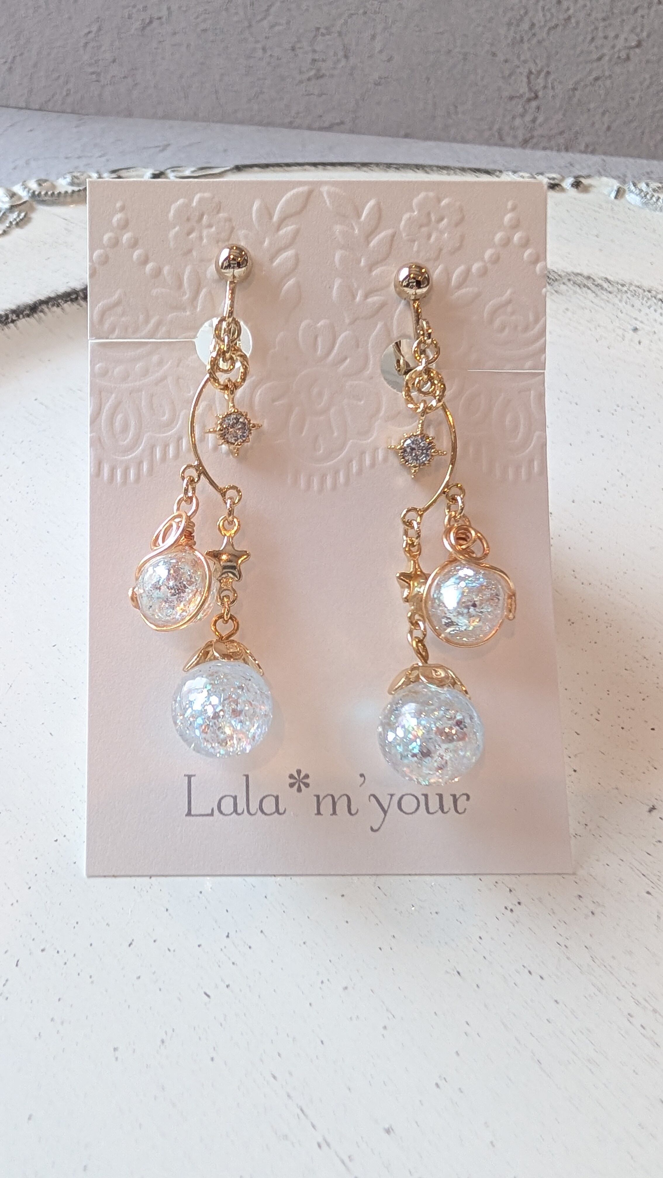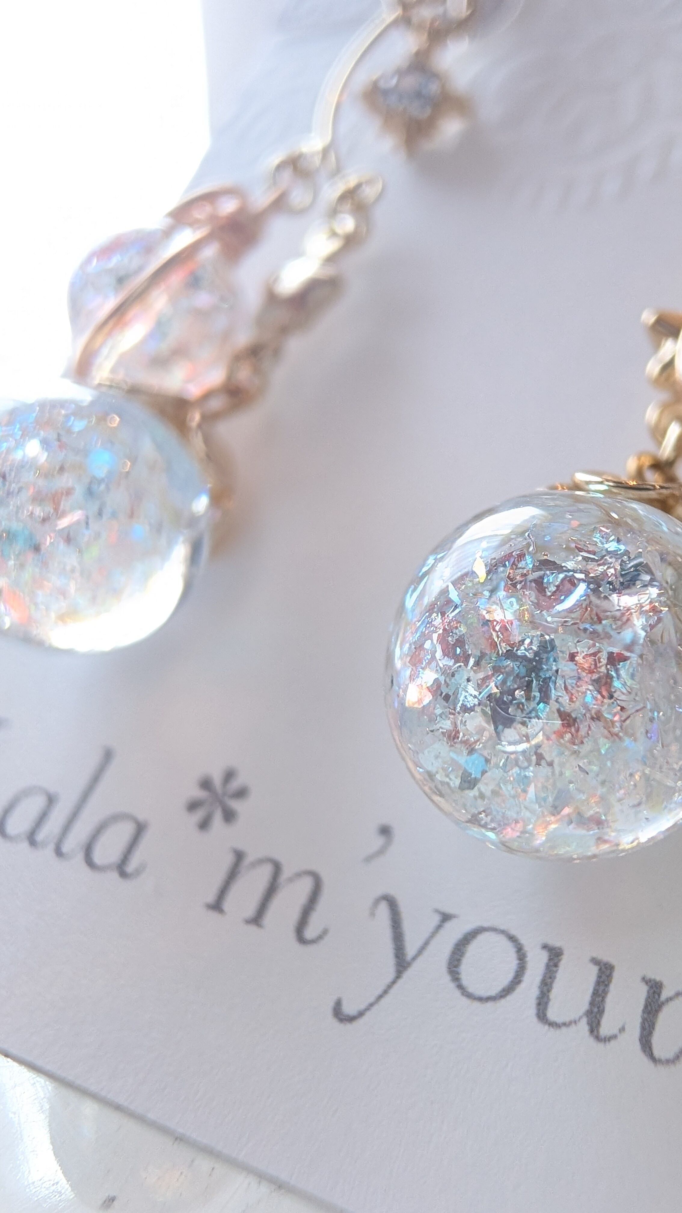 ワイヤーアートなし、透明感溢れるキラキラホログラムが乱反射するレジン球体が2粒並んだイヤリング/ピアスです。