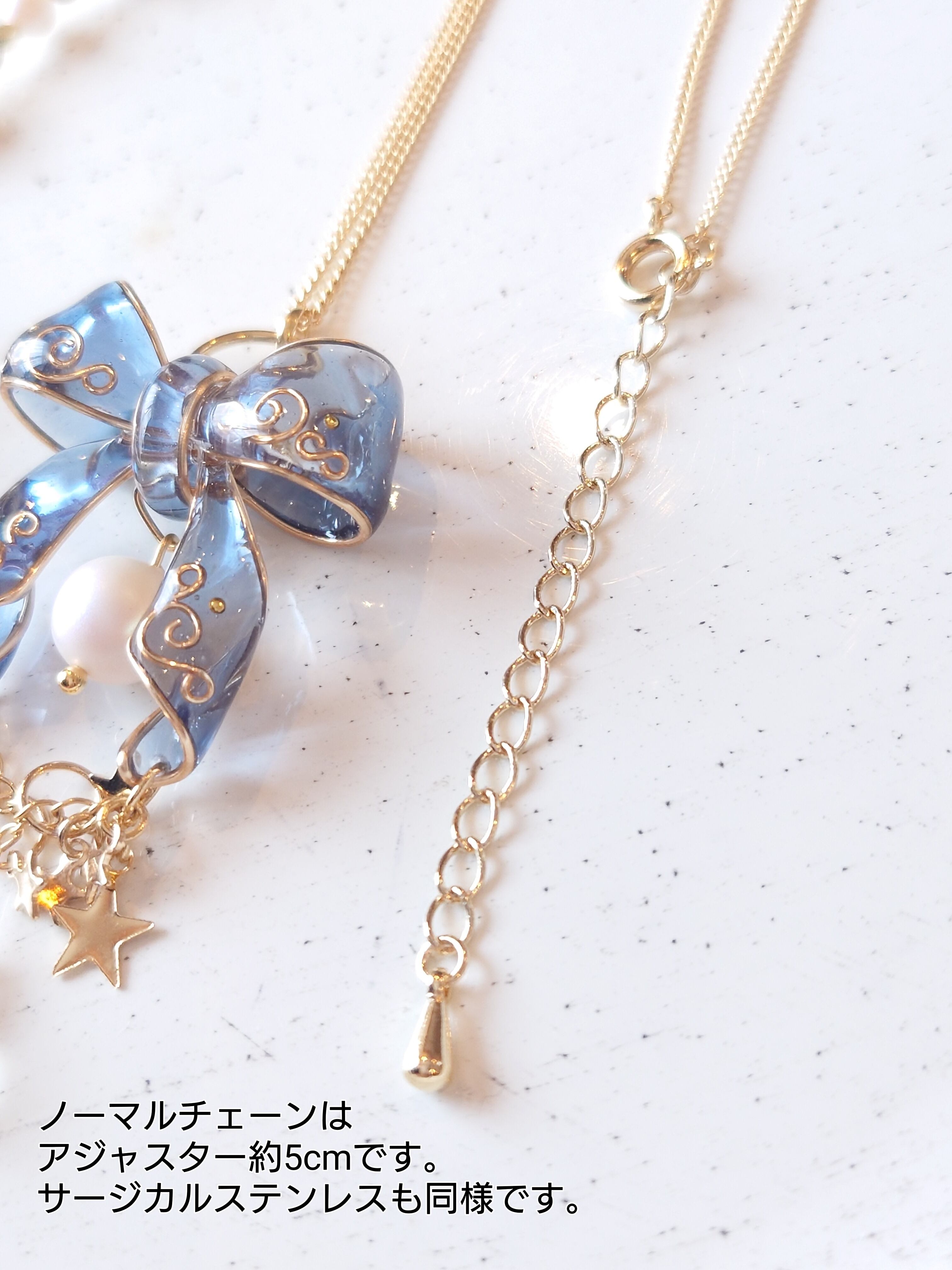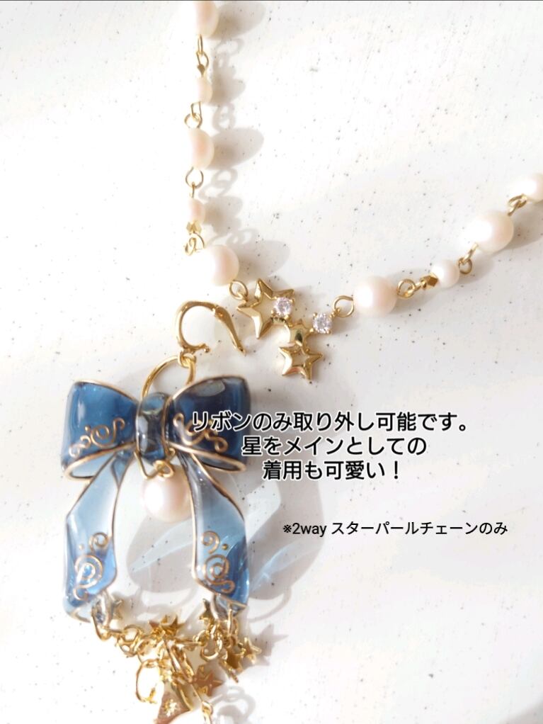 そしてこちらの最大の特徴は、リボンのみを取り外し、シンプルな星とパールのネックレスとしてもご使用いただける2way仕様のチェーンも選べます。その日の気分やお洋服、雰囲気に合わせてご愛用いただけます。長さ調整簡単なスライドボール式で、アジャスター約10cmございますので、ロングネックレスとしてもご愛用可能です。 スライドボールアジャスター長さ変更もオプションにて可能です。 デザインもリニューアルし、さらに可愛くなりました!