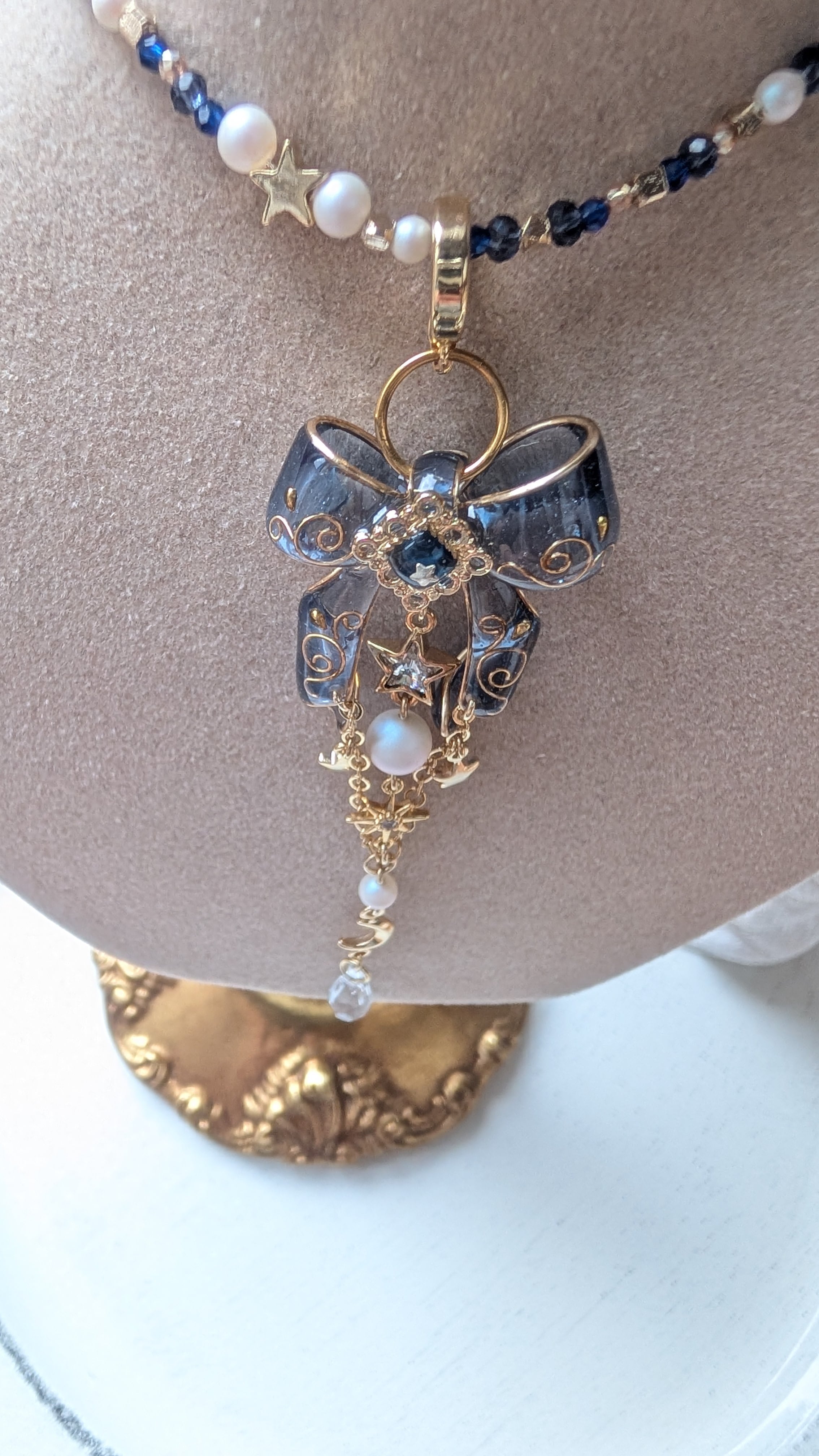 深い青やパール、ゴールドのメタルビーズは星空をイメージしています。