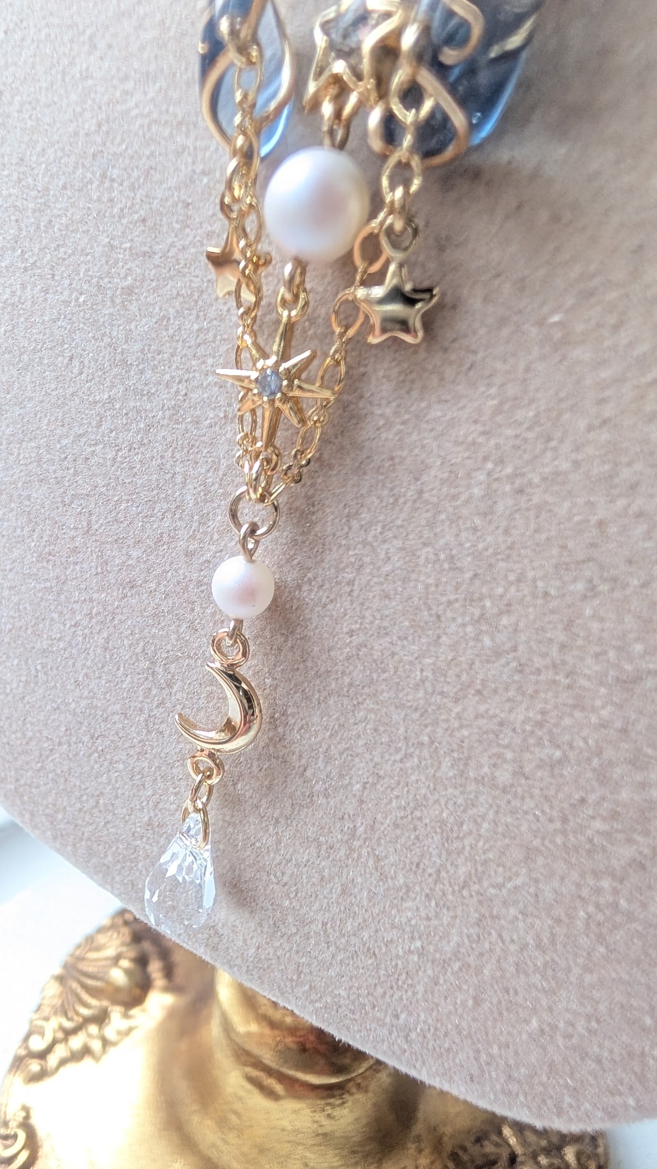 星屑のようなチェーンから揺れる月や星、クリスタルが綺麗でとても華やか。