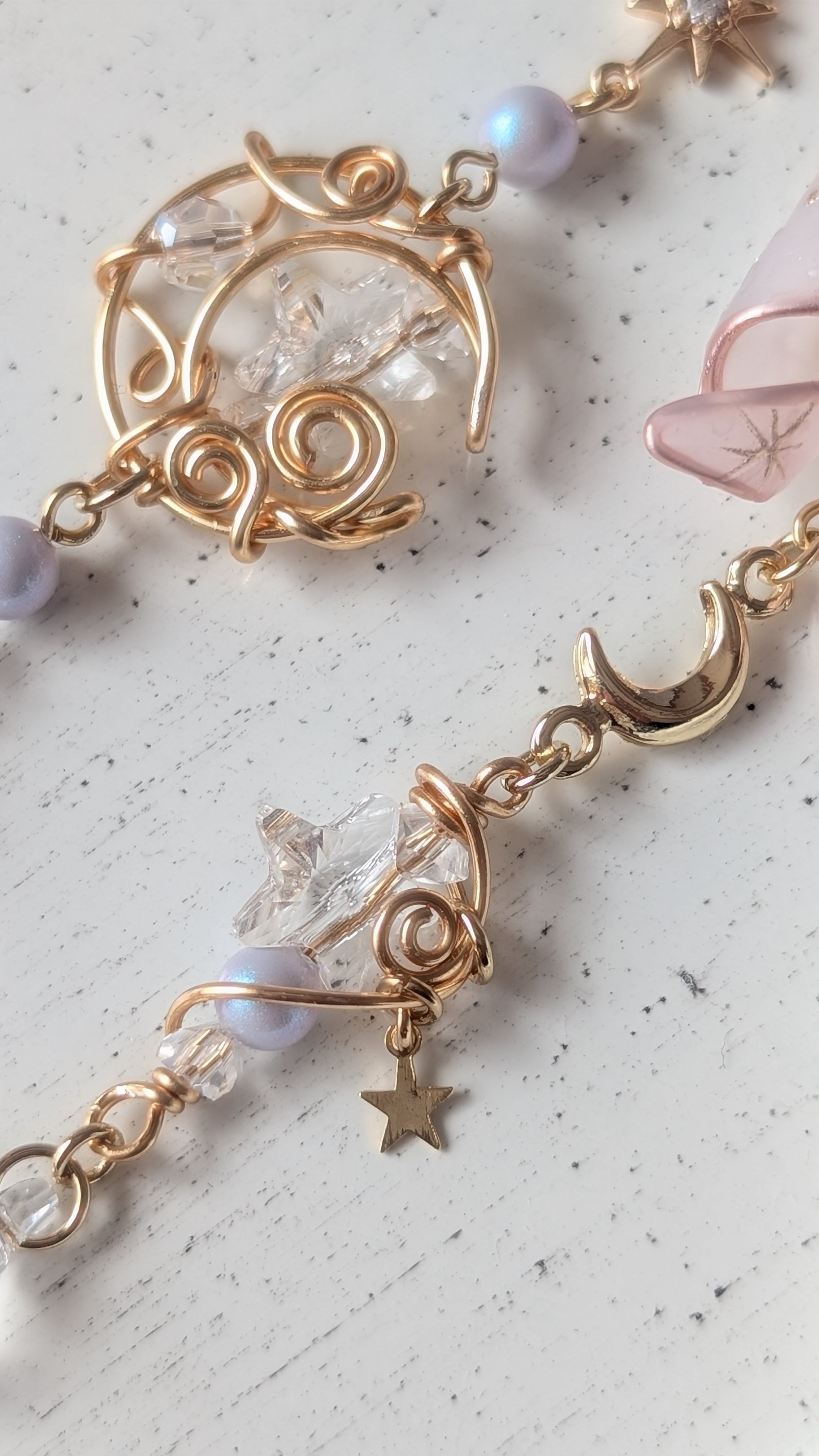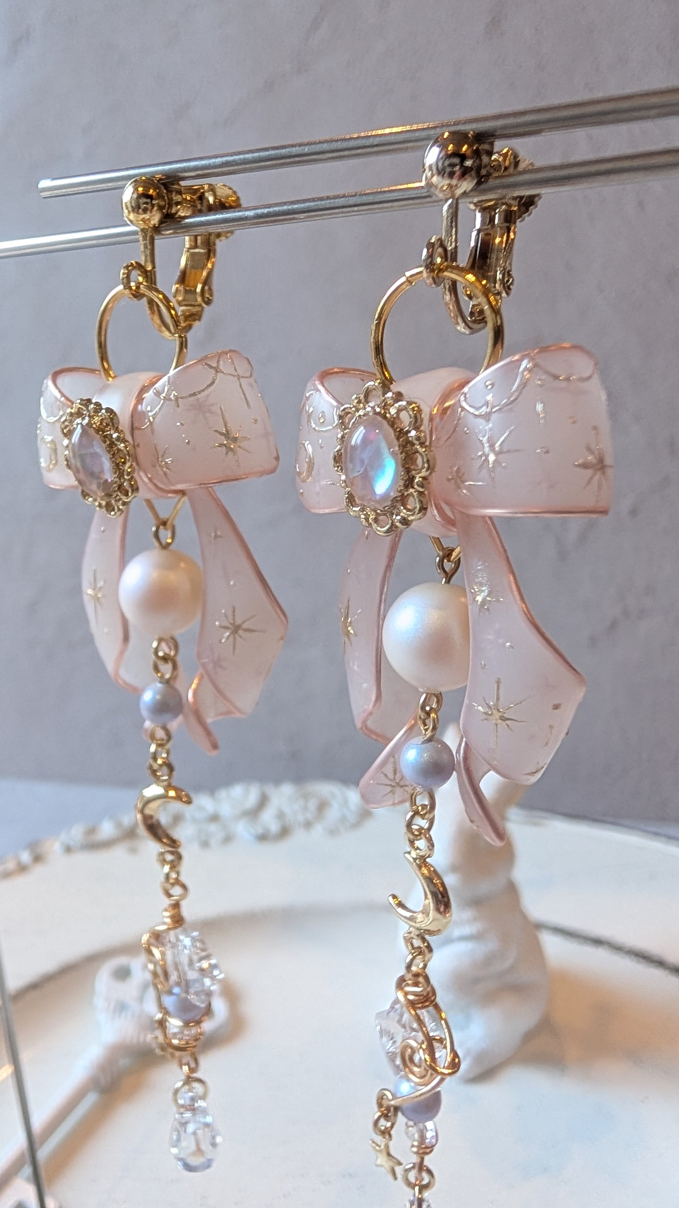 リボンには手描きの星空模様が施されていますが、よく見ると一層下にも模様があるため、奥行き感のある仕上がりになっています。角度でキラッと見え隠れするアートが推しポイント。そのリボンから揺れるロングなパーツたちにもこだわりました。手作業で加工した月とその下のワイヤーラッピング風パーツにはガラスの星が光ります。高品質なガラスパーツなのでサンキャッチャーのようにキラキラ。飾っても楽しめるアクセサリーです。